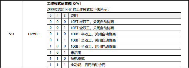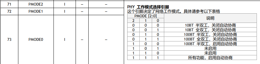 W5500的PHY工作模式支持两种配置方式,一种是通过PMODE管脚进行配置(硬件配置),另一种则是通过PHYCFGR寄存器的5:3位进行配置(软件配置), PHY工作模式可以配置为10Mbps(全双工/半双工),100Mbps(全双工/半双工),全功能自动协商以及掉电模式,默认为全功能自动协商模式。