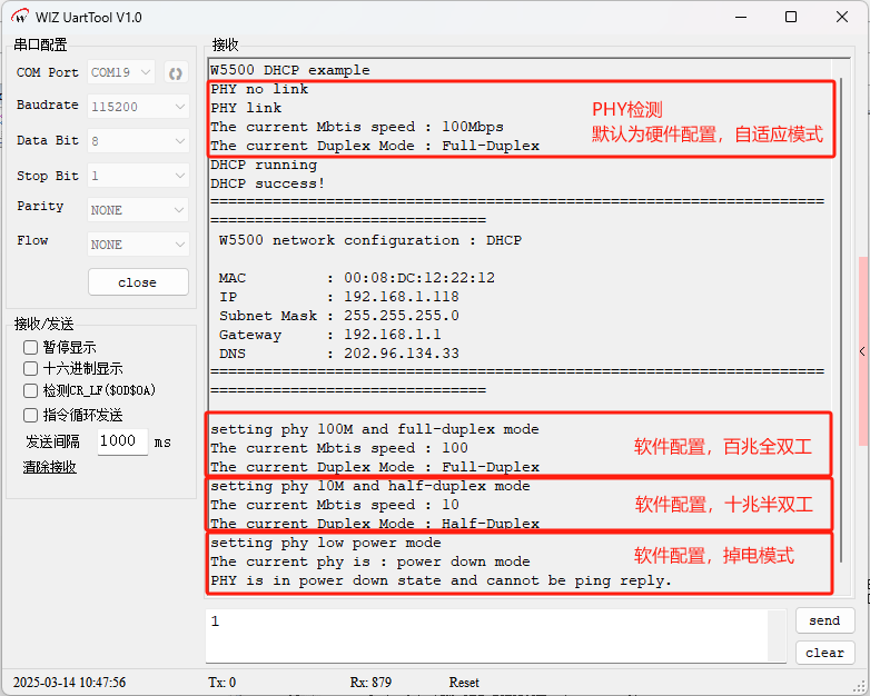 烧录例程运行后,首先可以看到进行了PHY链路检测,然后打印了设置的网络地址信息, 依次设置PHY为100Mbps全双工模式,然后设置PHY为10Mbps半双工模式,最后设置为PHY为掉电模式,打印信息如下图所示:
