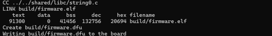 执行 make deploy 时,DFU-util 通过 USB 将固件编程到 MCU:deploy: $(BUILD)/firmware.dfu $(ECHO) "Writing $< to the board" dfu-util -a 0 -D $(BUILD)/firmware.dfu -R固件从 0x08005000 地址开始编程,从而保留闪存前 20KB 中的 DFU 引导加载程序。