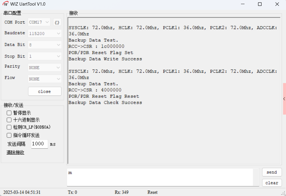 查复位标志RCC_FLAG_PORRST:若该标志置位,表明是 POR/PDR 复位,调用WriteToBackupReg函数写入数据,并输出写入成功信息。