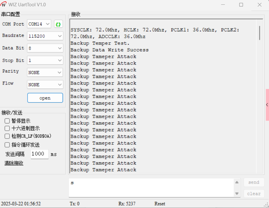 }- 当篡改引脚(默认 PB12)检测到低电平触发时,触发中断。