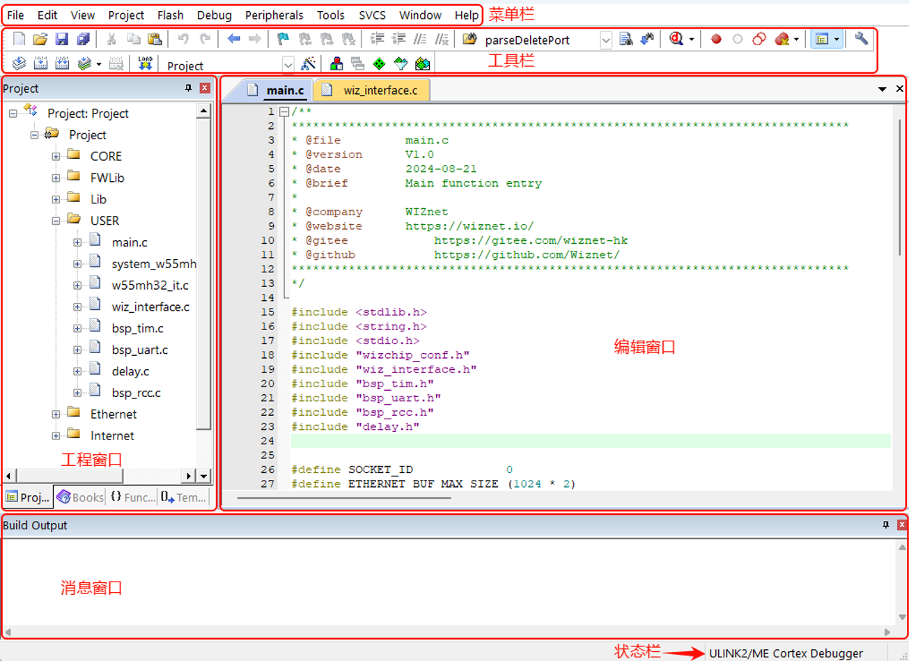 - 工程窗口:主要显示项目内容,文件组、源文件和头文件等