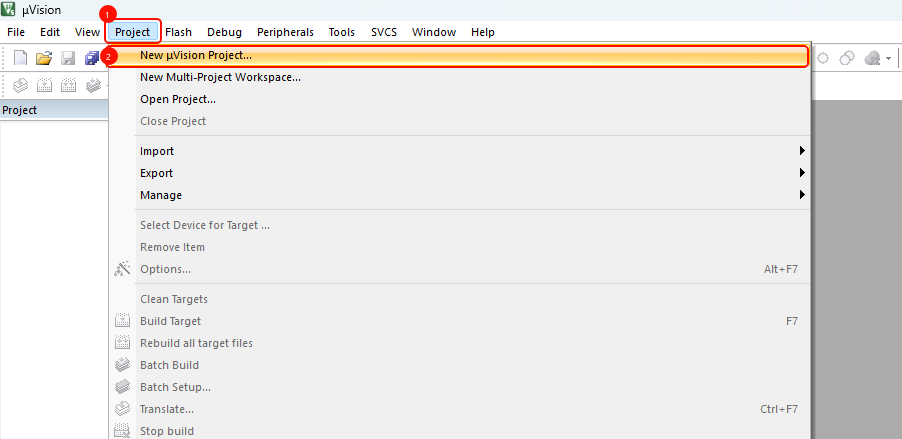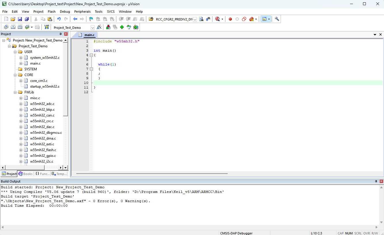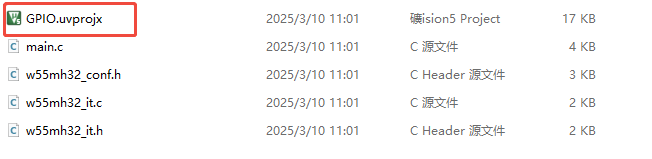 对于KEIL5打开工程文件,主要找到.uvprojx后缀名文件。 前面的部分例程直接找到.uvprojx文件打开即可, 从新建工程-固件库版本例程开始就是以工程模板形式打开项目,此时.uvprojx文件主要存放在Project文件夹下,找到并双击打开: