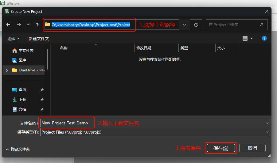 然后新建一个文件夹用于存放工程文件(注意路径不要有中文)->输入工程文件的名称->点击保存: