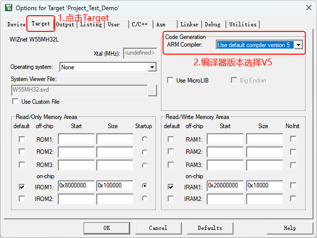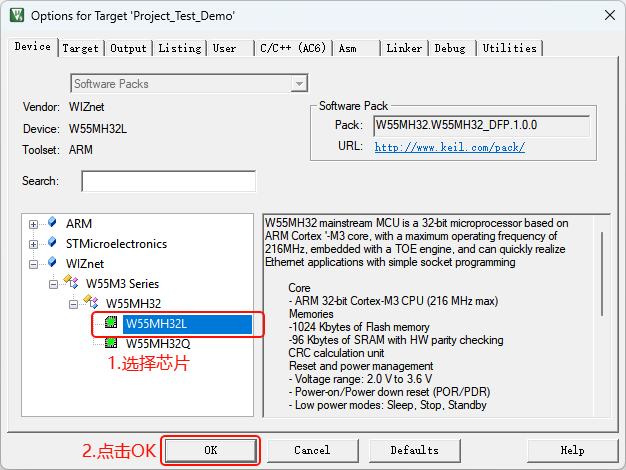 保存之后会弹出Select Device for Target ‘Target 1’...的窗口,依次点开WIZnet->W55M3 Series->选择W55MH32L芯片,然后点击OK: