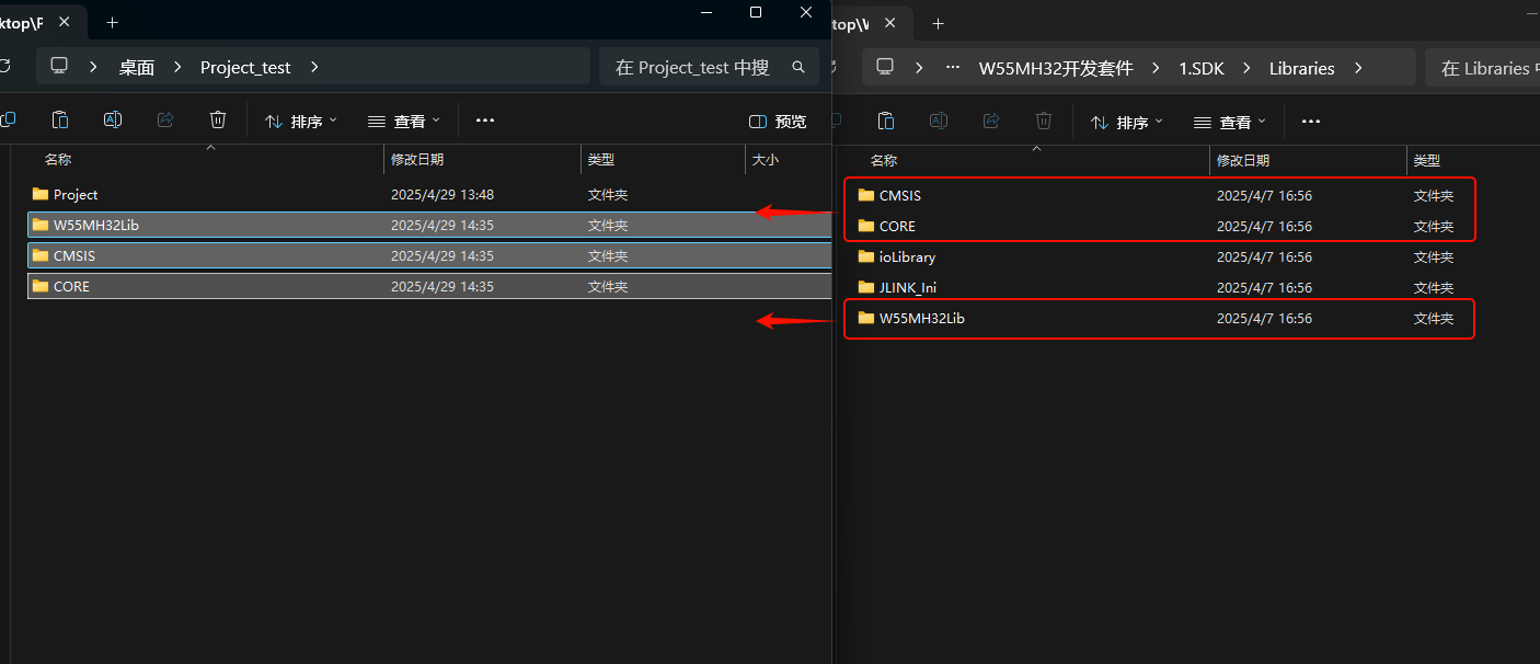将开发套件里1.SDK/Libraries文件夹下的启动文件、内核文件和库文件等复制粘贴到新建的项目目录下: