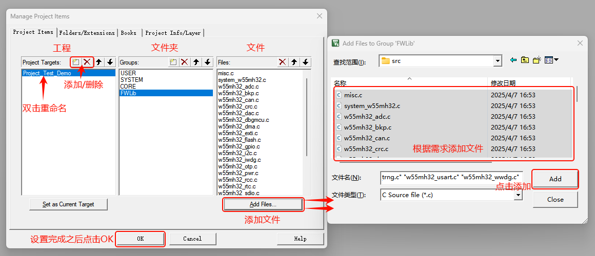 在该窗口我们可以添加或删除工程、文件夹和文件,并为其重命名。文件可以根据需求添加,不清楚文件的作用或者觉得后续反复添加文件麻烦的也可以一次性全部添加: