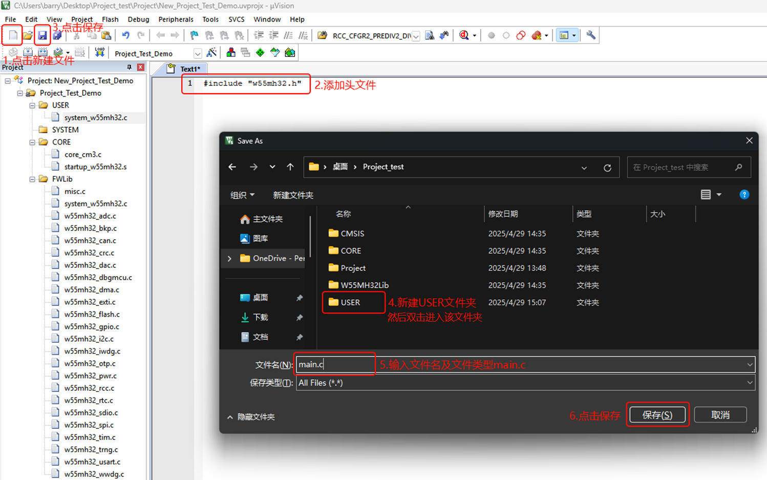 新建文件->在该文件里输入#include "w55mh32.h"添加头文件>点击左上角保存按钮->新建USER文件夹并双击打开->输入文件名和文件类型main.c->点击保存: