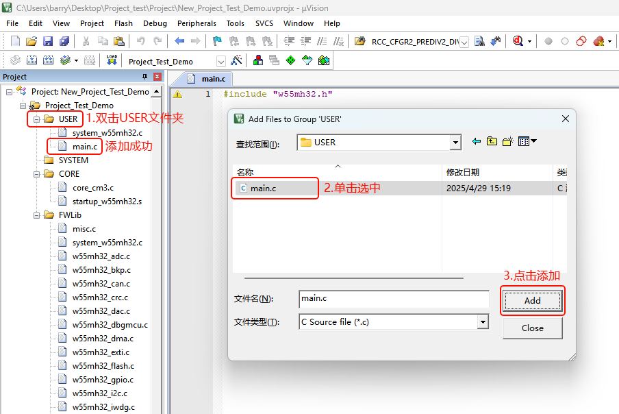 双击USER文件夹->找到main.c并单击选中->点击Add添加文件: