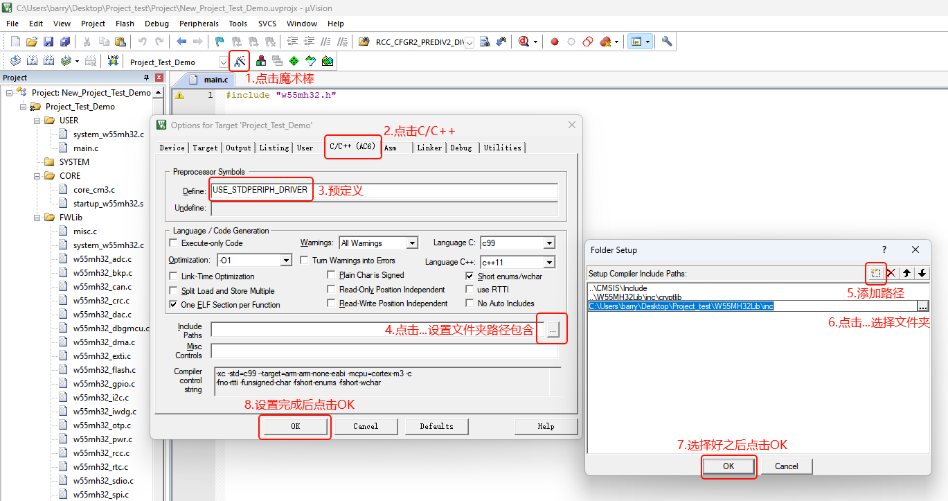 点击魔术棒->点击C/C++->Define输入USE_STDPERIPH_DRIVER预定义->点击Include Paths右边的...设置文件夹路径包含->添加路径->点击路径右边的...预览并选择文件夹->点击OK->点击OK: