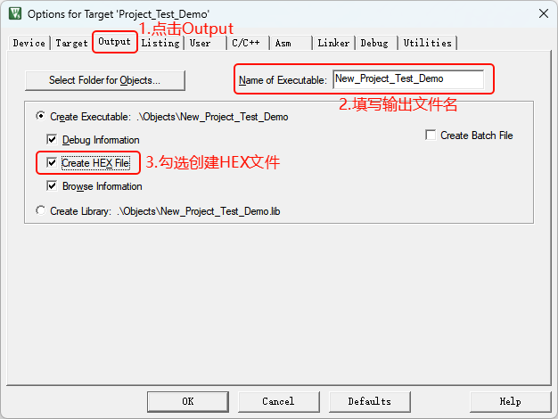 点击Output->填写输出的文件名->勾选创建HEX文件:
