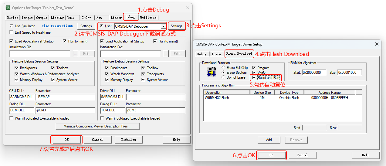 点击Debug->选择CMSIS-DAPDebugger下载调试方式->点击Settings->点击Flash Download->勾选自动复位->点击OK->点击OK: