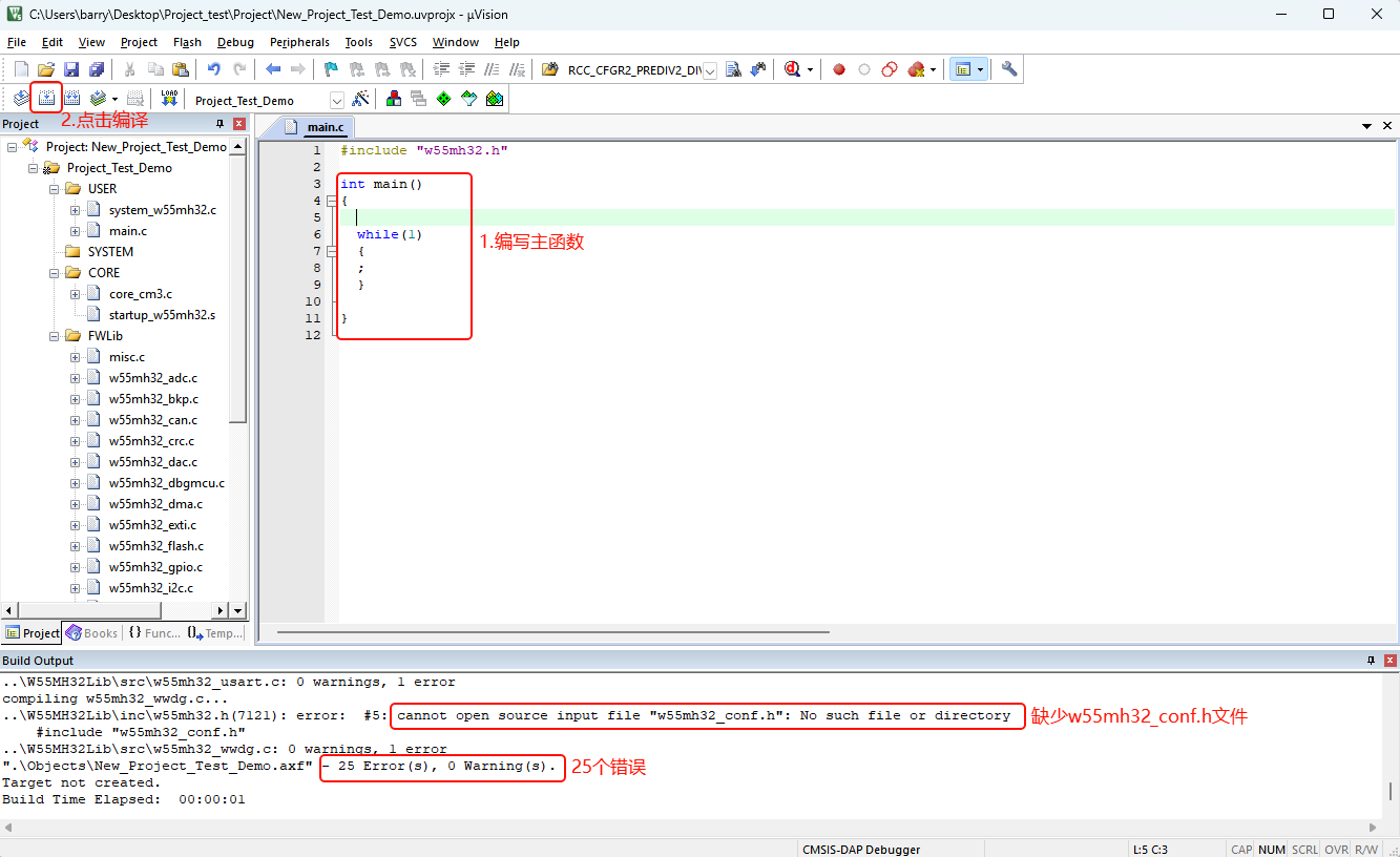 在main.c里面编写主函数,点击编译发现有25个错误,提示缺少w55mh32_conf.h文件: