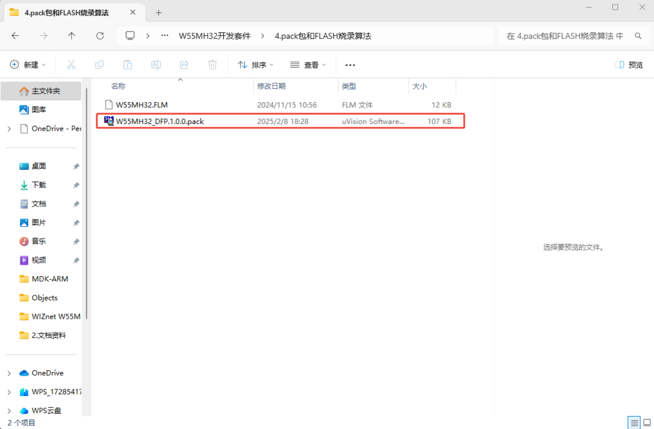 打W55MH32开发套件文件夹下的4.pack包和FLASH烧录算法文件夹,双击安装W55MH32_DFP.1.0.0.pack包: