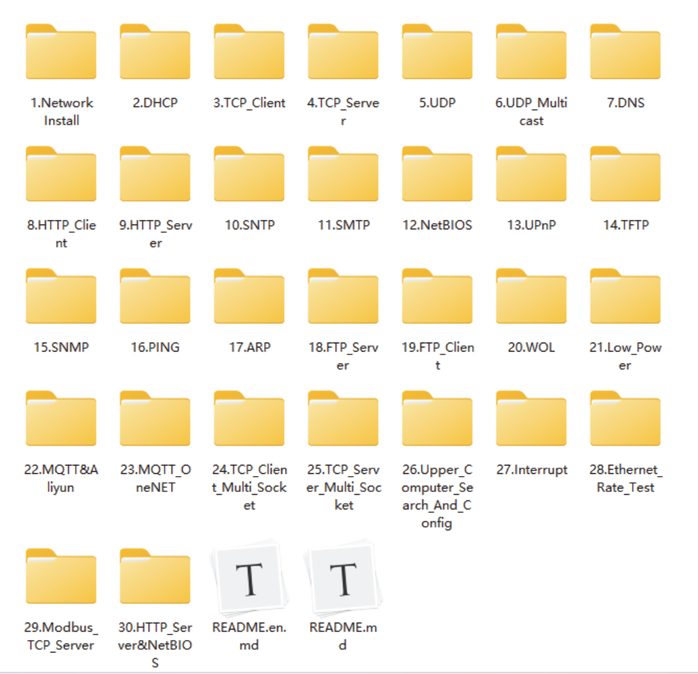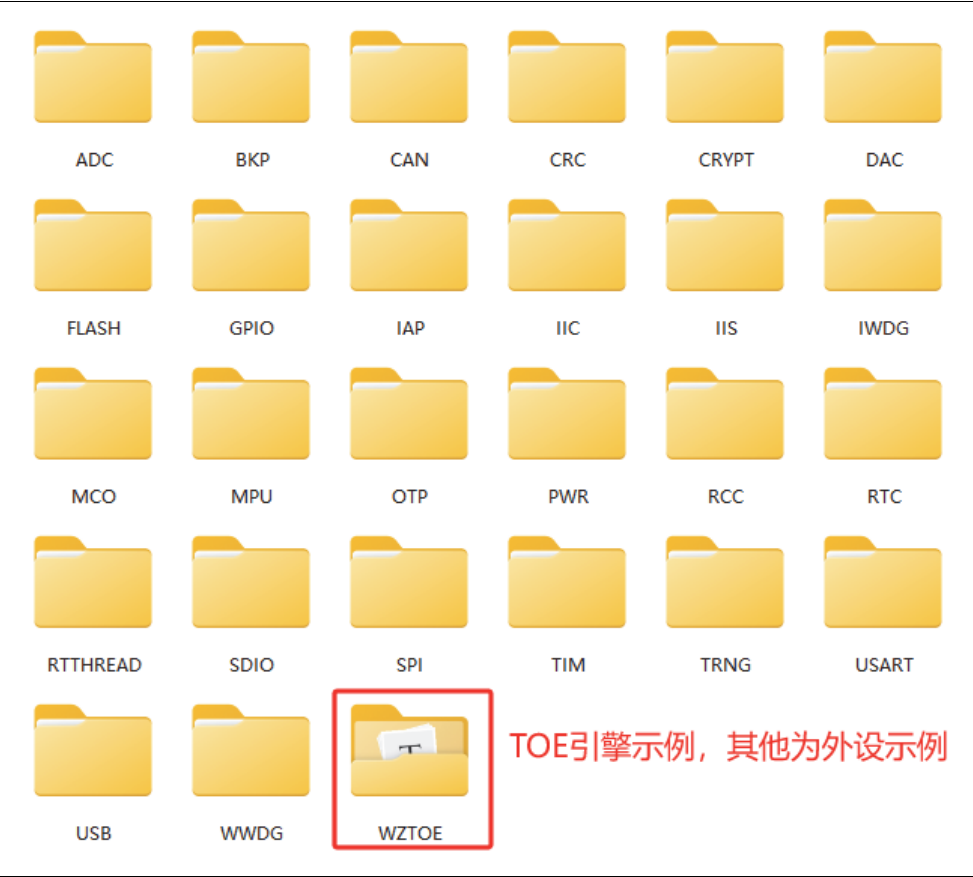 打开资料包中的 SDK\ModuleDemo 文件夹,里面包含了大部分外设示例以及 TOE 引擎示例: