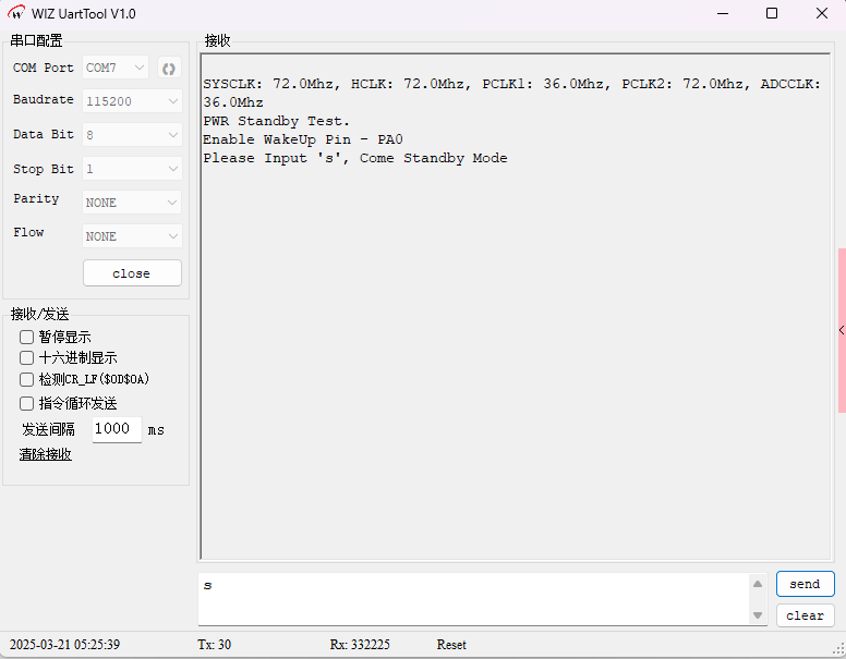 通过 printf()函数输出系统时钟频率信息,并提示用户可以通过输入 s 使设备进入待机模式。