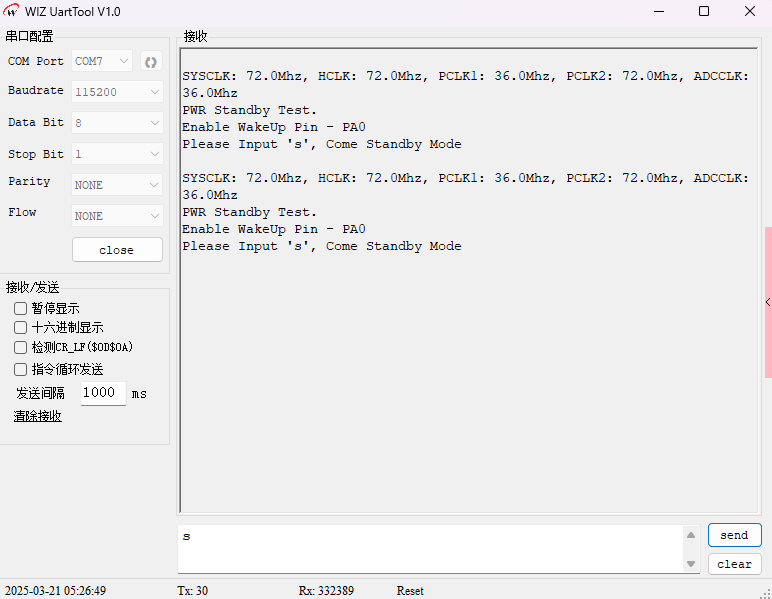 这段代码的主要功能是允许用户通过串口输入 s 命令使 W55MH32 设备进入待机模式,同时使能了唤醒引脚(PA0),可以在待机模式下通过该引脚唤醒设备。在进入待机模式前,将所有 GPIO 引脚配置为模拟输入模式以降低功耗。通过串口可以输出系统时钟频率信息和操作提示。