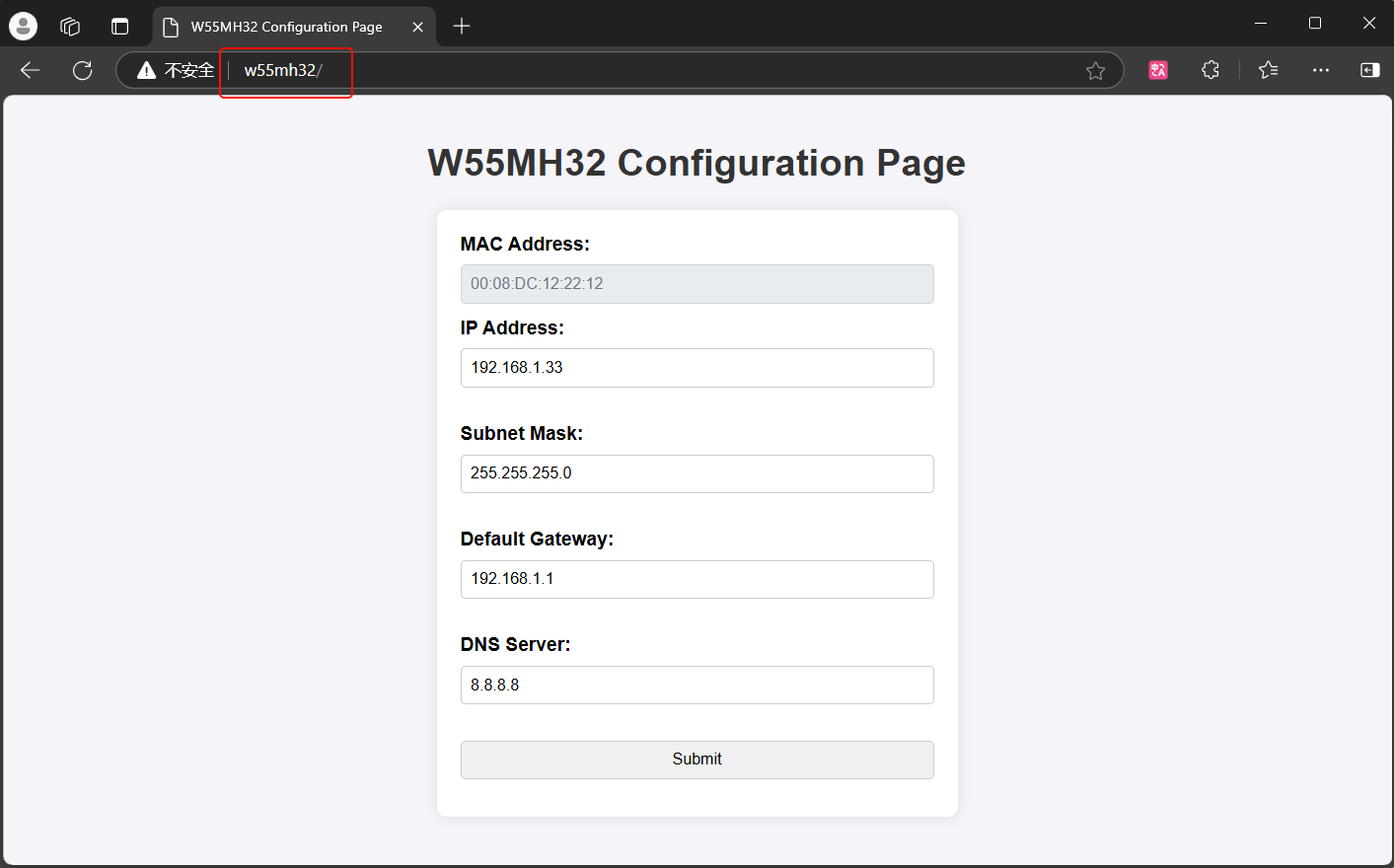 烧录例程运行后,首先进行了PHY链路检测,然后是通过DHCP获取网络地址并打印网络地址信息, 通过NetBIOS名称解析打印提示解析名称,接着我们打开浏览器,输入W55MH32/进行即可访问网页信息: