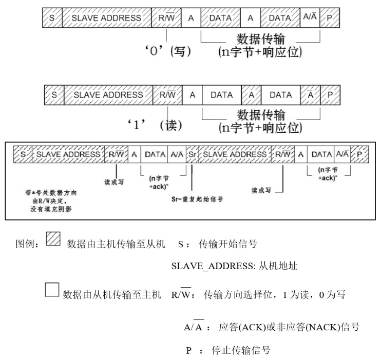 先看看I2C通讯过程的基本结构,它的通讯过程见下图,主机写数据到从机 、 主机由从机中读数据 及图 I2C通讯复合格式 :