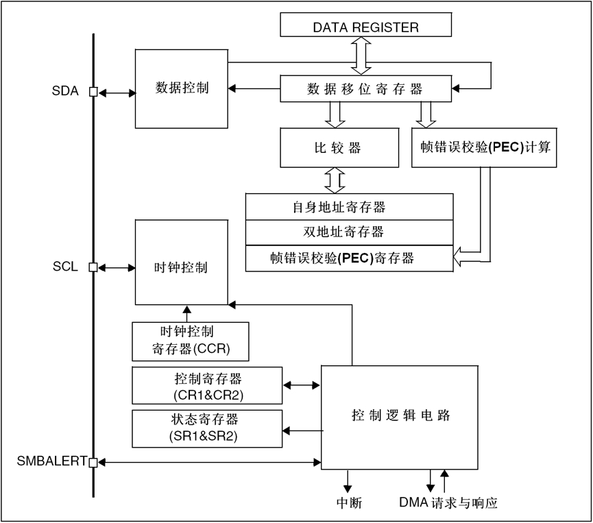 整体控制逻辑负责协调整个I2C外设,控制逻辑的工作模式根据我们配置的“控制寄存器(CR1/CR2)”的参数而改变。在外设工作时, 控制逻辑会根据外设的工作状态修改“状态寄存器(SR1和SR2)”,我们只要读取这些寄存器相关的寄存器位,就可以了解I2C的工作状态。 除此之外,控制逻辑还根据要求,负责控制产生I2C中断信号、DMA请求及各种I2C的通讯信号(起始、停止、响应信号等)。