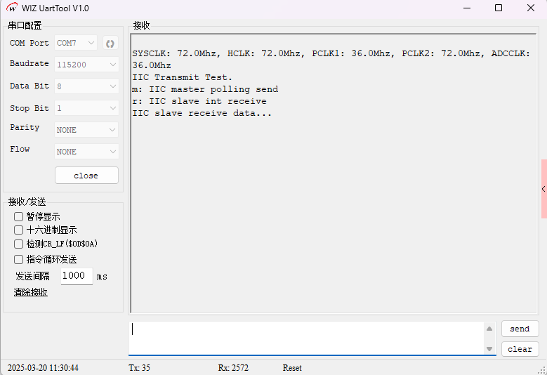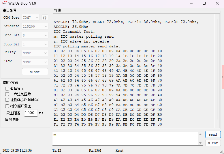 进入无限循环,等待用户输入命令:输入m,执行 I2C 主设备轮询发送测试。