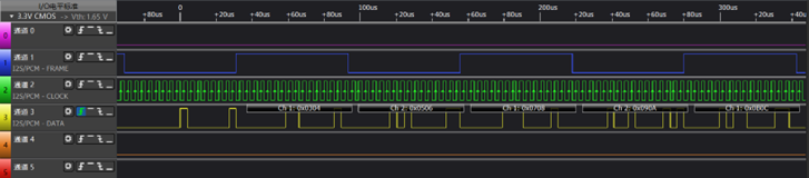 首帧和尾帧的数据实际已经可以看到有数据脉冲信号,未解析属于硬件初始化特性(FIFO填充)或解析器同步延迟原因,不影响实际音频功能。
