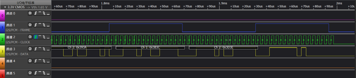 同样的,首帧和尾帧的数据实际也已经可以看到有数据脉冲信号,未解析属于硬件初始化特性(FIFO填充)或解析器同步延迟原因,不影响实际音频功能。