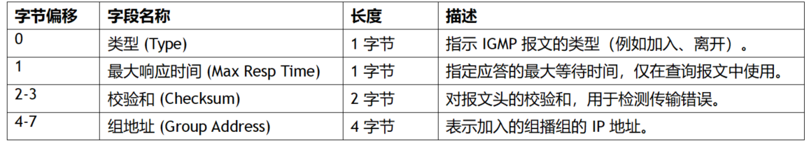 IGMP 加入组播组时发送的报文是IGMP Membership Report报文。其格式如下: