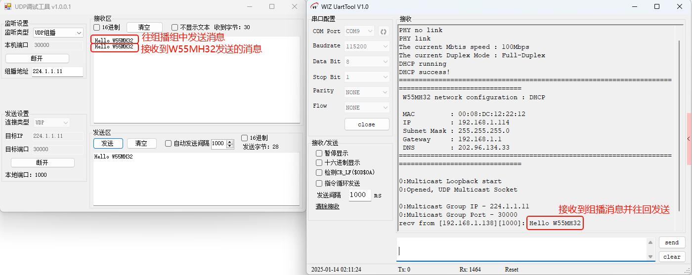 W55MH32 UDP组播通讯测试