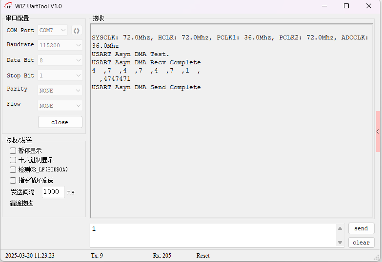 接收操作: 先禁用 DMA1 通道 4,使能 USART1 的接收 DMA 请求,调用 DMA_RecvConfiguration 函数配置 DMA 接收,等待接收完成标志置位,打印接收完成信息并逐个输出接收到的数据。