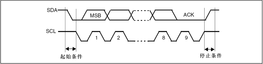 前文中提到的起始(S)和停止(P)信号是两种特殊的状态,见下图,起始和停止信号 。 当 SCL 线是高电平时 SDA 线从高电平向低电平切换,这个情况表示通讯的起始。 当 SCL 是高电平时 SDA 线由低电平向高电平切换,表示通讯的停止。起始和停止信号一般由主机产生。
