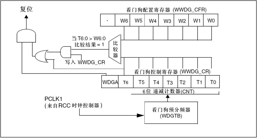 窗口看门狗时钟来自PCLK1,PCLK1最大是108M,由RCC时钟控制器开启。